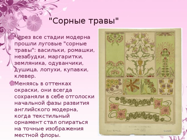 - Через все стадии модерна прошли луговые "сорные травы": васильки, ромашки, незабудки, маргаритки, земляника, одуванчики, душица, лопухи, купавки, клевер.