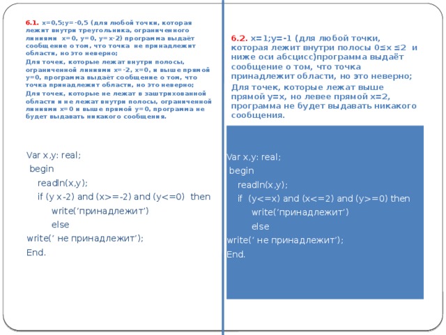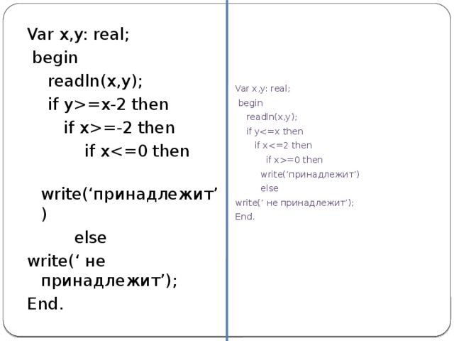 =0 then write(‘принадлежит’) else write(‘ не принадлежит’); End. Var x,y: real; begin readln(x,y); if y=x-2 then if x=-2 then if x write(‘принадлежит’) else write(‘ не принадлежит’); End. " width="640"