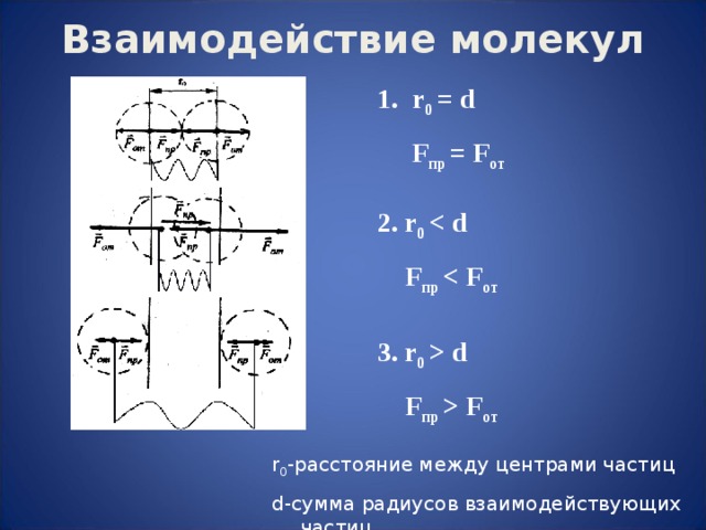 d F пр F от r 0 - расстояние между центрами частиц d- сумма радиусов взаимодействующих частиц " width="640"