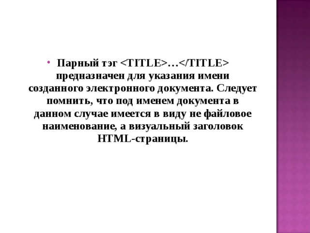 - Парный тэг TITLE … TITLE предназначен для указания имени созданного электронного документа. Следует помнить, что под именем документа в данном случае имеется в виду не файловое наименование, а визуальный заголовок HTML-страницы.