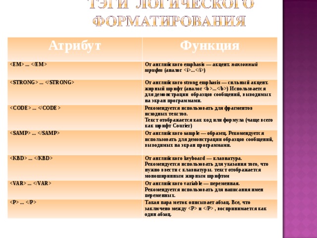... i ) ... От английского strong emphasis — сильный акцент. жирный шрифт (аналог b ... b ) Использвается для демонстрации образцов сообщений, выводимых на экран программами. CODE ... CODE Рекомендуется использовать для фрагментов исходных текстов. Текст отображается как код или формула (чаще всего как шрифт Courier) ... От английского sample — образец. Рекомендуется использовать для демонстрации образцов сообщений, выводимых на экран программами. ... От английского keyboard — клавиатура. Рекомендуется использовать для указания того, что нужно ввести с клавиатуры. текст отображается моноширинным жирным шрифтом ... От английского variable — переменная. Рекомендуется использовать для написания имен переменных. ... Такая пара меток описывает абзац. Все, что заключено между и , воспринимается как один абзац. " width="640"
