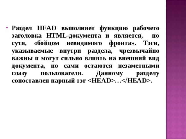 - Раздел HEAD выполняет функцию рабочего заголовка HTML-документа и является, по сути, «бойцом невидимого фронта». Тэги, указываемые внутри раздела, чрезвычайно важны и могут сильно влиять на внешний вид документа, но сами остаются незаметными глазу пользователя. Данному разделу сопоставлен парный тэг HEAD … HEAD .