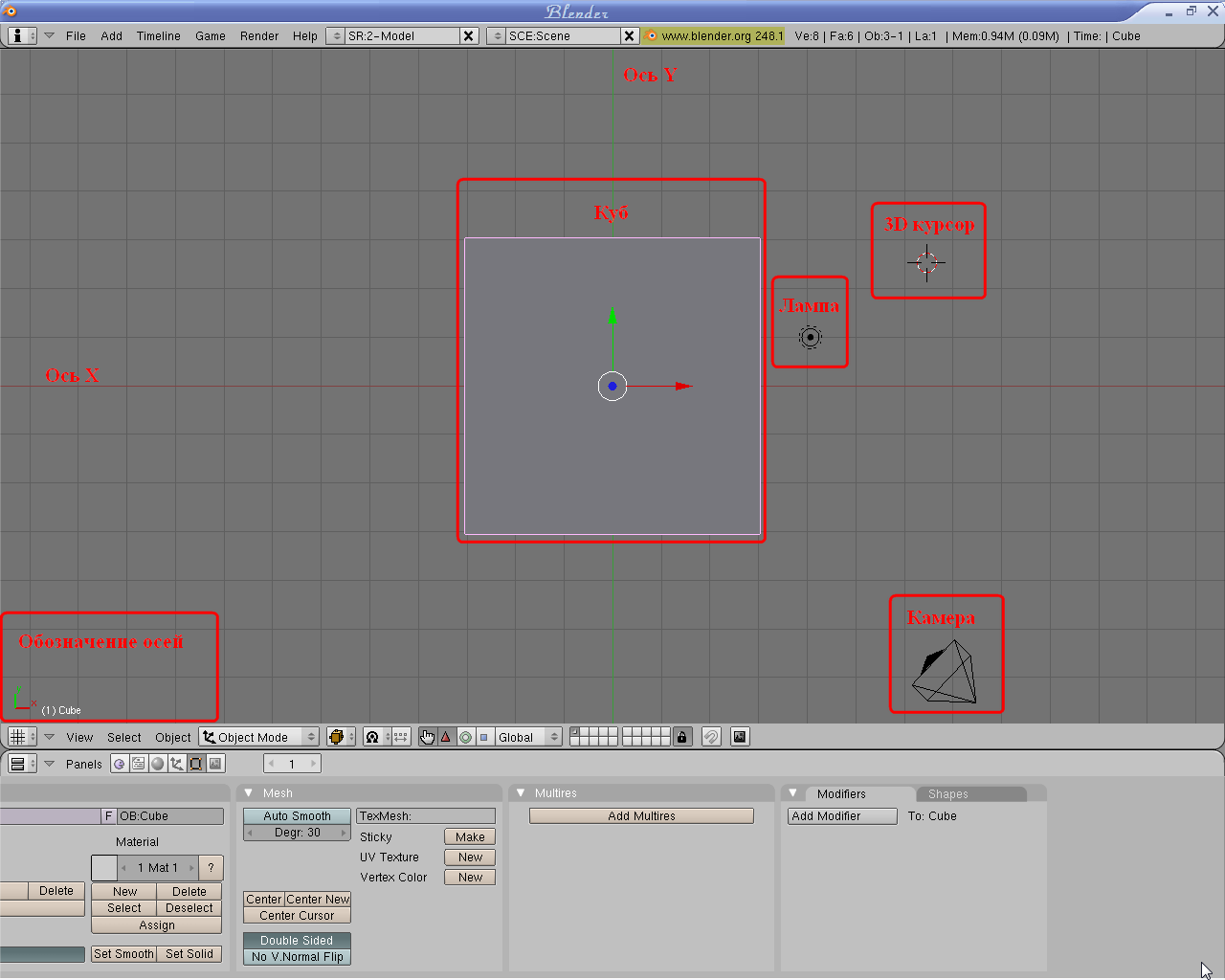 Куб - это отображаемый объект. Если он не понадобится, его следует удалить. Лампа служит источником света (без неё конечное изображение было бы чёрным), а камера необходима для отображения конечного изображения. С помощью камеры мы видим изображение под тем или иным углом. Все вместе (в данном случае, куб, лампа, камера) формируют сцену – представление события.