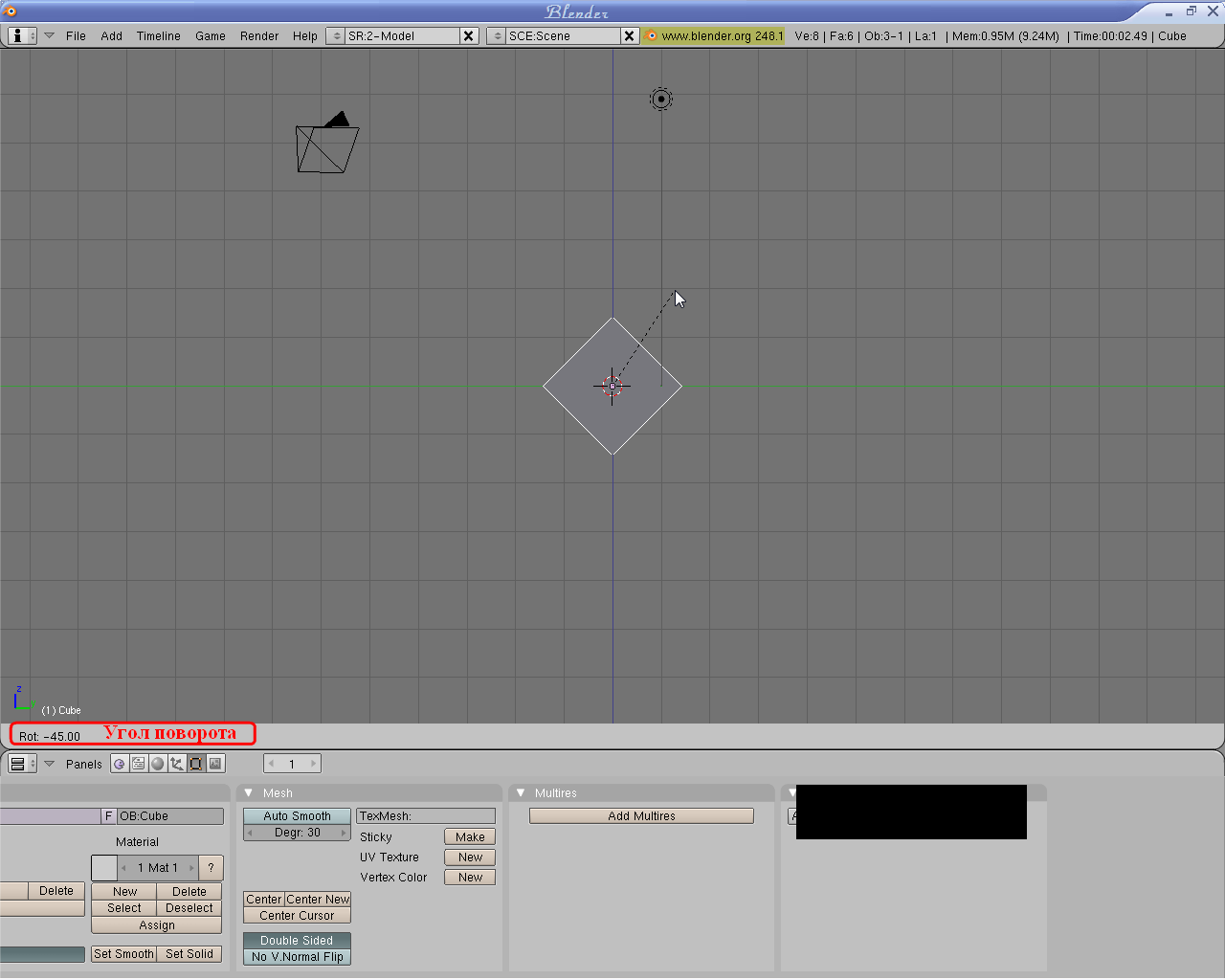Объекты, находящиеся на сцене (куб, камера, лампа и т.д.), можно передвигать, менять их угол наклона.