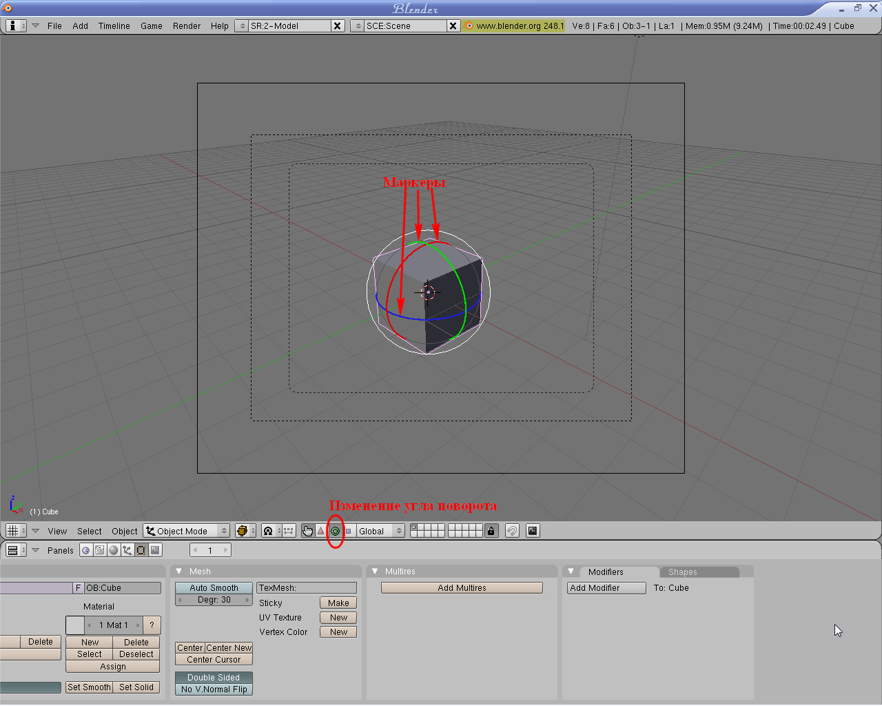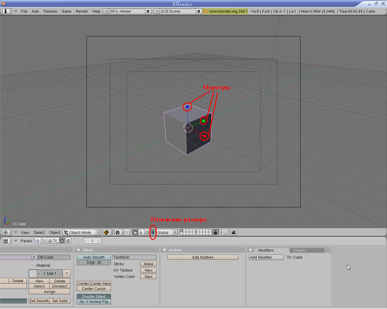 После включения любой из этих трёх кнопок у выделенного объекта появляются маркеры. Для внесения изменений следует навести курсор мышь на маркер, зажать левую кнопку и перемешать мышь.