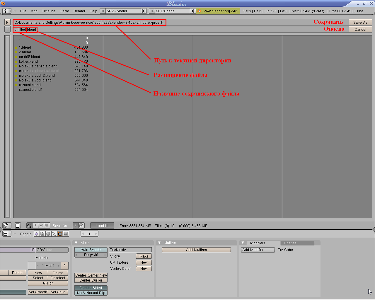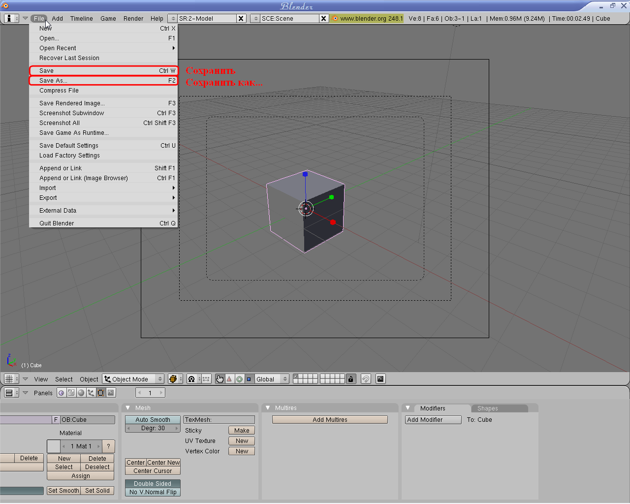 Задание 13. Сохранение файловСледует запомнить: в Blender при закрытии программы не выводится диалоговое окно с предложением сохранить файл. Поэтому об этом следует позаботиться заранее, иначе можно безвозвратно утратить только что созданное произведение.