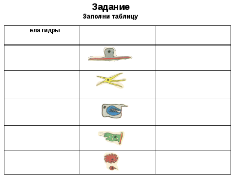 Учитель: Способность гидры к регенерации нашла отражение в названии этого животного. Оно связано с древнегреческой мифологией. В одном из мифов о Геракле рассказывается, как он сразился с лернейской гидрой. (сообщение ученика).(приложение №1).(СЛАЙД 16) (СЛАЙД 17) Учитель: Так и наша гидра обладает высокой регенеративной способностью. Если её тело разрезать поперек, то на одной из её половинок вырастают щупальца и появляется рот, а на другой возникает стебелек. Получаются две гидры. Даже её небольшого кусочка образуется целостный организм. Человек использует гидру как лабораторное животное, на котором изучает особенности регенерации. Регенерацию гидры можно рассматривать и как один из способов её размножения. Вопрос: А какими еще способами может размножаться гидра? (СЛАЙД 18, 19, 20, 21, 22) Учитель: Ребята, вы любите сказки? ( сообщение - Сказка про то, как гидра всех удивляла – ученика).(Приложение №2). Учитель: Хочу обратить ваше внимание на многообразие клеток, образующих тело гидры: (СЛАЙД 23) Пользуясь учебником ( стр. 105-106) заполните таблицу.(СЛАЙД 24), (карточка №4)