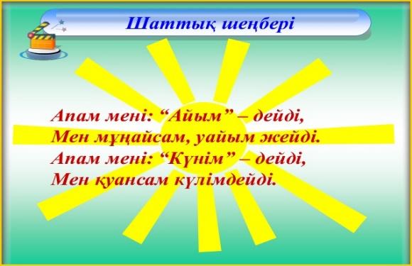 | 1.Ұйымдастыру кезеңі (оқушылардың сабаққа қатысуын тексеру, оқу – құрал жабдықтарының дайындығын байқау, сабаққа қойылатын талаптармен таныстыру.) 2. Сабақтың басталуына жағымды әсер ететін көңіл – күй қалыптастыру. 3. «Шаттық шеңберін»құрып, ынтымақтастық атмосферасын орнату. 4. Сабақтың мақсатымен таныстыру. |