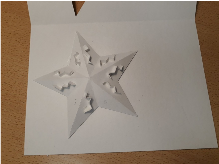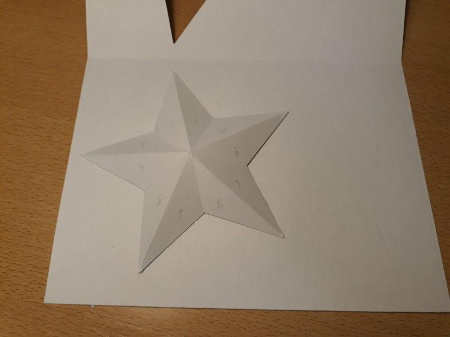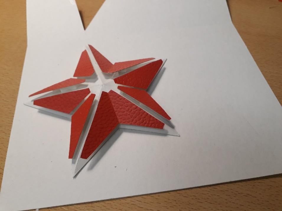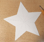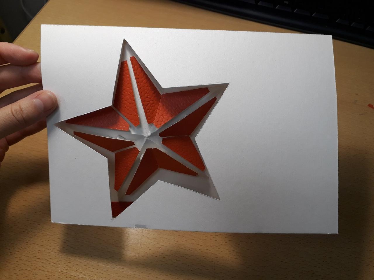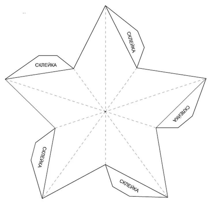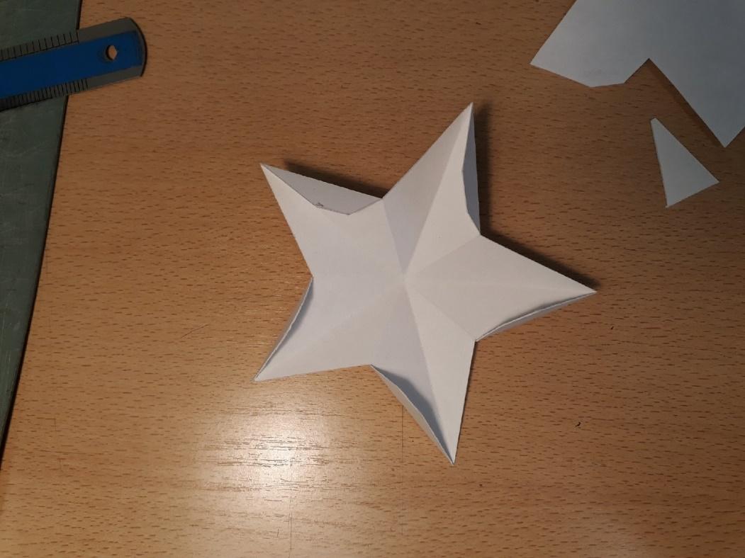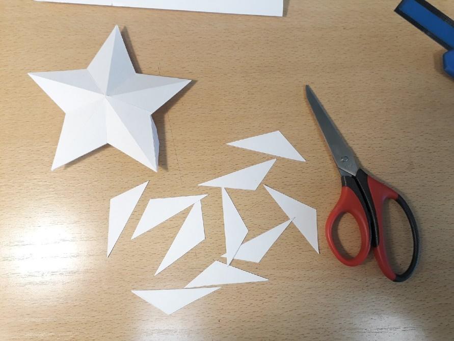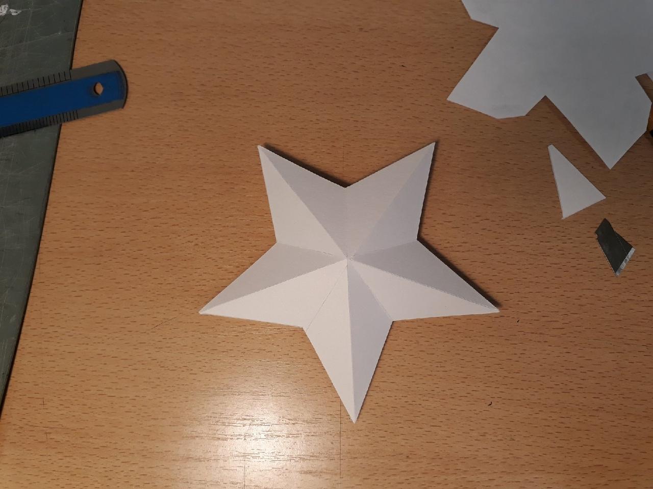 Вторым этапом нам нужно вырезать и собрать объемную звезду. Что бы звезда сложилась также как показано на фото, для этого нужно надрезать оси пересечения звезды, тогда сгиб линии будет ровным и не ломаным.