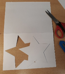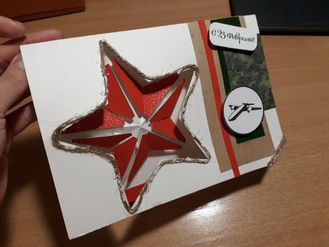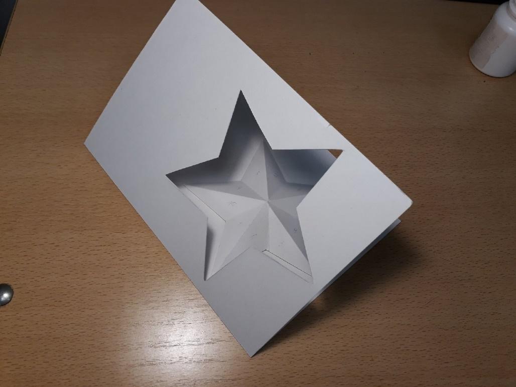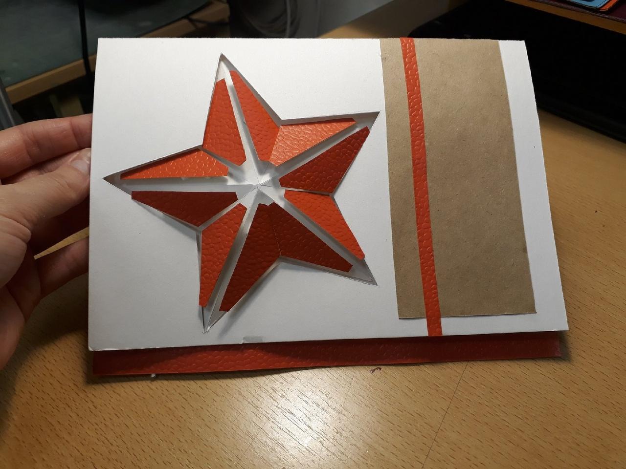 Третьим этапом, обводим звезду на открытке лицевой стороны. Далее вырезаем звезду. Вырезанную звездочку не выкидываем, она нам пригодится для дальнейших действий.