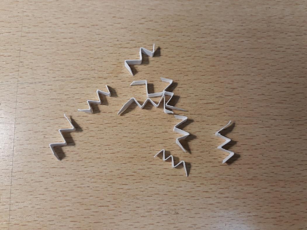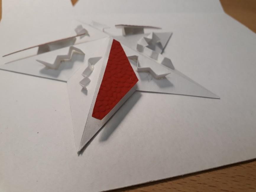 ля того что бы сделать визуальный объем, мы из полоски складываем зигзаг; полученный зигзаг приклеиваем ребром на основание звезды. Далее на зигзаг приклеиваем красный полигон, и так делаем с каждой деталью.