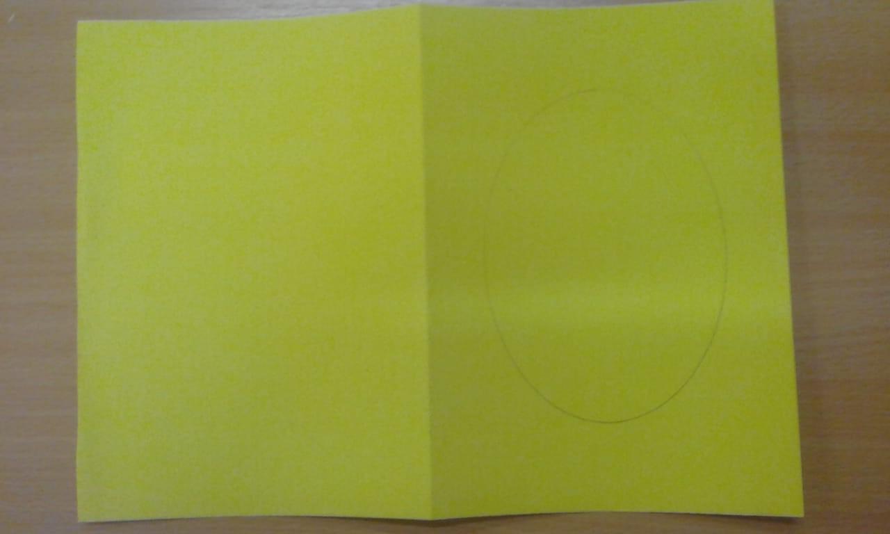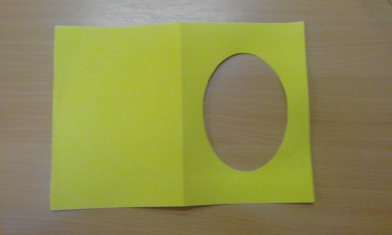У каждого на парте шаблон для открытки. Готовую вышивку приклеиваем с изнаночной стороны, приклеиваем на первую и вторую половинки белый лист бумаги.