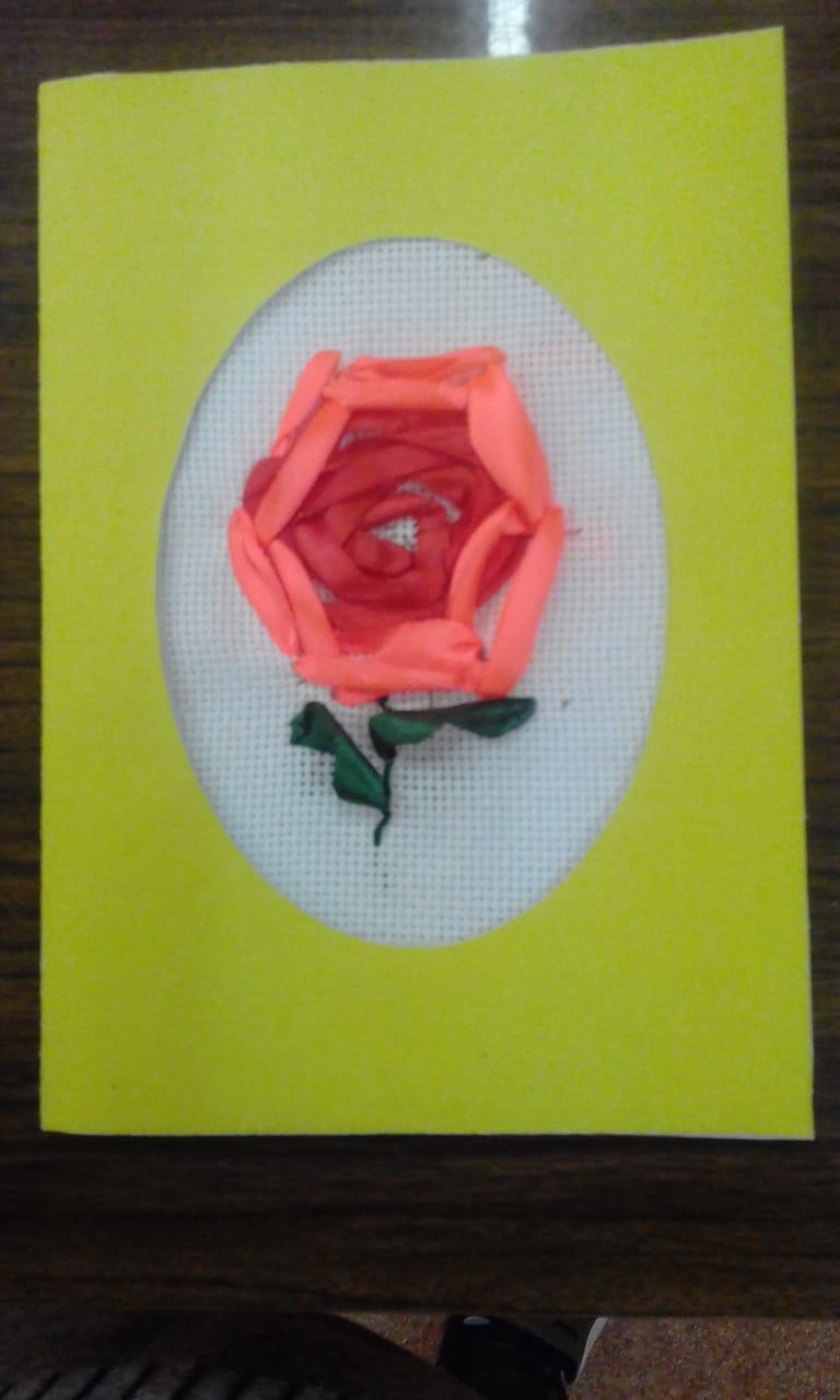 У каждого на парте лежит дидактическая схема, по которой мы будем вышивать розу. Вышивка розы послужит нам декоративным оформлением поздравительной открытки, которую мы можем подарить своим друзьям, родным на любой праздник.