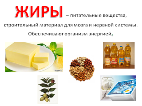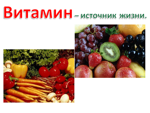 «Белки» – строительный материал для клеток. Нужно, чтобы вы росли, развивались, чтобы были работоспособными, не поддавались болезням, могли им сопротивляться. Чтобы вырасти, ты, мог, В пище должен быть белок. Он в яйце, конечно, есть, В твороге его не счесть. В молоке и в мясе тоже Есть он и тебе поможет. «Углеводы» – топливо для клеток, как бензин для машины, основной источник энергии для подвижных игр, бега, физической и умственной работы. Фрукты, овощи и крупы – Удивительная группа – Нам в тепло и в непогоду Поставляют углеводы, Нам клетчатку посылают, Витамины добавляют И энергией питают. «Жиры» – продовольственные и топливные склады (склад еды, топлива, одежды), прежде всего. Строительный материал для мозга и нервной системы. Жир, что в пище мы едим, Очень нам необходим: Сохранит температуру, Повлияет на фигуру, Защитит от холодов, Шубой нам служить готов. -Какой можно сделать вывод? Какую роль выполняют жиры, белки и углеводы? Вывод: белки-для роста и развития, углеводы- основной источник энергии, жиры- строительный материал для мозга и нервной системы. -Ребята, а что еще должно быть в продуктах, чтобы мы были здоровыми? (витамины). -Каждой клеточке нашего организма необходимы витамины. Как выдумаете, почему нам необходимы витамины? Чтобы ответить на этот вопрос, мы выслушаем группу наших исследователей, которые провели свои исследования готовясь к этому уроку.