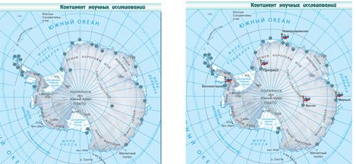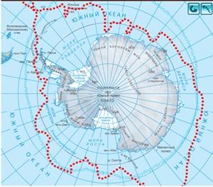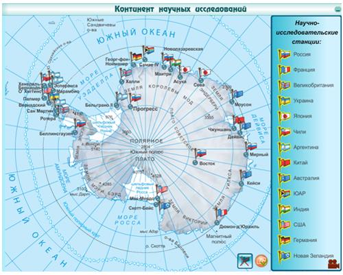Обратите внимание на интерактивную карту научных исследований Антарктиды. В какой части материка расположены в основном научные станции разных стран мира? – по побережьям материка.