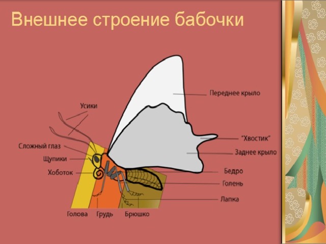 - Тело бабочек делится на три главных отдела: голову, грудь и брюшко.