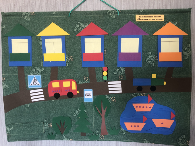 Панель изготовлена из ткани и прорезиненного картона «Математическая улица» там же в кармашке находится три набора цифр от 1 до 5. Она предназначена для совместной деятельности педагога и детей.