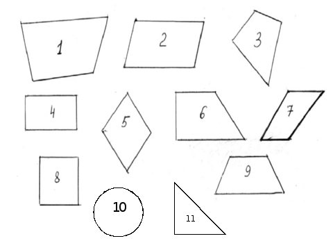Сегодня мы познакомимся с одним из видов четырехугольников. Посмотрите на фигуры и разбейте их на две группы. (Необходимо добиться, чтобы учащиеся разбили фигуры на параллелограммы и другие фигуры.)
