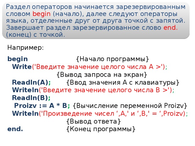 ') ; {Вывод запроса на экран} Readln(A) ; {Ввод значения А с клавиатуры} Writeln ('Введите значение целого числа В ') ; Readln(B) ; Proizv := A * В ; {Вычисление переменной Proizv} Writeln ('Произведение чисел ‘,А,' и ‘,В,' = ‘,Proizv) ; {Вывод ответа} end. {Конец программы} " width="640"