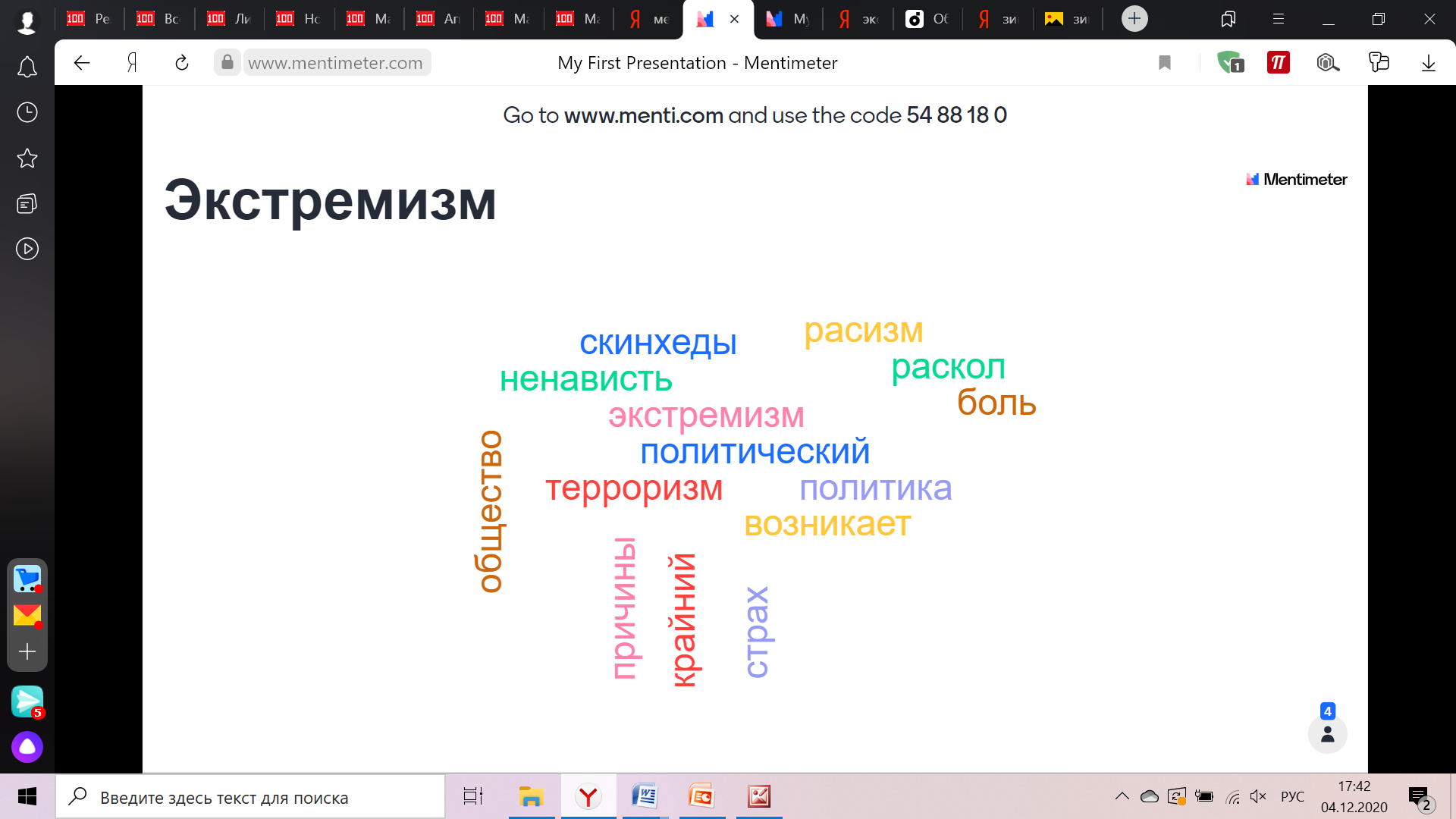 Учитель: Как вы думаете, почему в нашей многонациональной стране бывают проявления экстремизма? Давайте попробуем выявить причины этого. (Используется программа menti.com, голосование. Результат голосования выводится на экран)