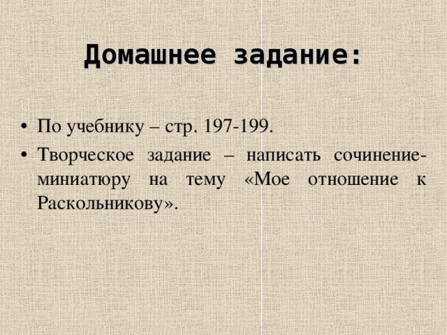 - Творческое задание – написать сочинение-миниатюру на тему «Мое отношение к Раскольникову».