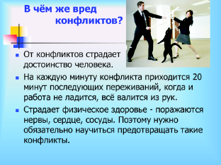 Конфликт — это столкновение, противоречие, которое рождает враждебность, страх, ненависть между людьми. В чем же вред конфликтов?