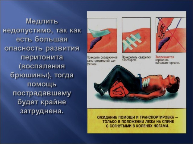 - Очевидно у раненого тяжелое ранение живота. Непосредственная угроза жизни раненого от ранения живота. Первая медицинская помощь 1. Обезболивание. 2. Наложить повязку на рану живота. Выпавшие внутренности не вправлять, а фиксировать повязкой к брюшной стенки. 3.Укутать для профилактики общего переохлаждения. 4.Срочная транспортировка в лечебное учреждение