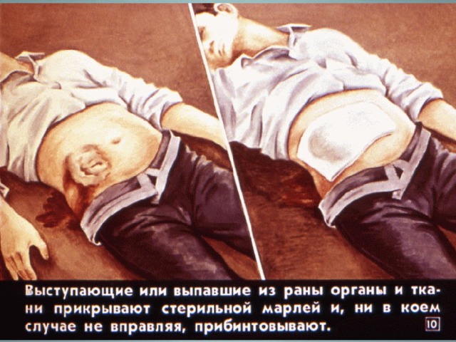 Если обнажились внутренние органы, нужно накрыть их чистой влажной тканью или стерильными салфетками