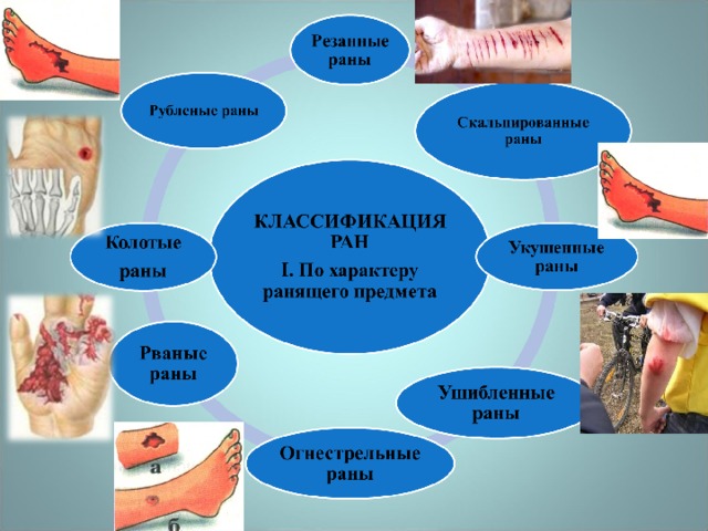 - простые ранения – с повреждением кожи и подкожной клетчатки; осложнённые – с повреждением костей, сосудов и нервов; комбинированные – с ожогами, отморожениями.