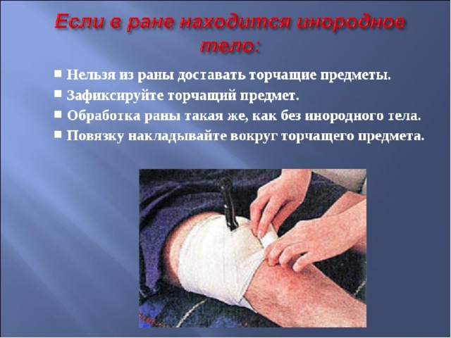 Первая медицинская помощь при ранениях имеет целью остановить кровотечение (хотя бы временно), защитить рану от загрязнения и проникновения в неё микробов, ослабить болевые ощущения у пострадавшего.