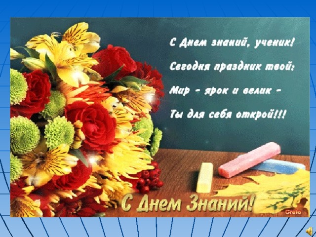-Ну, что ж, вот и положено начало новому учебному году. Доказательством тому сейчас мы услышим школьный звонок, который дадут уч-ся 1 класса.(Слайд 22)