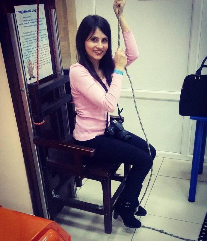 Экскурсовод подходит к первому экспонату «Подъемный стул»: