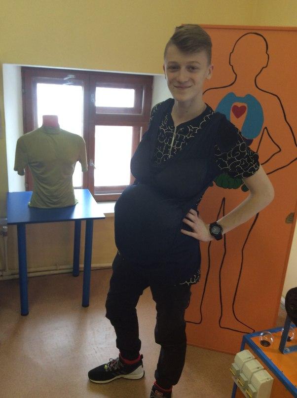 Э: Следующее испытание для мальчиков на храбрость. Нужно отважиться примерить жилет, который имитирует беременность женщины на 7 месяце. (Надевает на одного из ребенка). Тяжело? А теперь попробуй наклониться и завязать шнурки от ботинка так, чтобы не примять животик, иначе ребенок может пострадать. Вот и представьте, ребята, девушкам каждый день нужно ходить по магазинам, наводить порядки, не раз наклоняться и завязывать свою обувь, как им тяжело. А ведь это еще только седьмой месяц, дальше вес наберется!