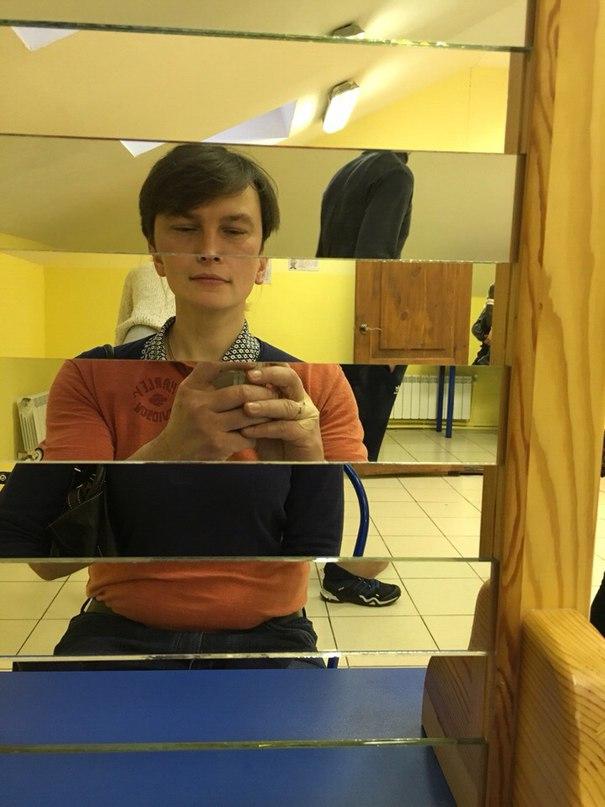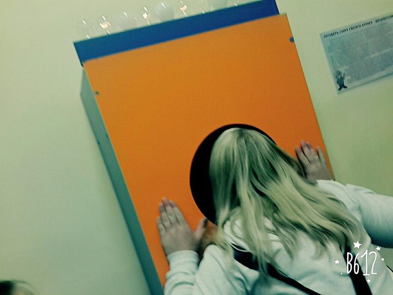 Э: Для следующего экспоната потребуется два человека одинакового роста. Рассаживаемся по обе стороны. Смотрим: есть пустоты, через которые мы видим части тела своего соседа и есть зеркала, через которое мы видим свое отражение. Составляем единое лицо и получаются забавные рожицы.