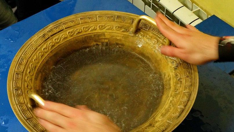 Э: Ну а следующее испытание на проверку волшебные ваши ручки или нет. Перед вами стоит медный таз. Если смочить руки водой и начать тереть по душкам таза, то внутри образуются фонтанчики. (Показывает сам как это сделать). На самом деле никакая это не магия. Это происходит от трения. По душкам таза проходит звуковая вибрация. Так же она идет по самому тазу и рисунку на нем. И если присмотреться, то фонтанчики возникают как раз в тех местах, где они и нарисованы. Попробуйте сами, но это не у каждого получается.