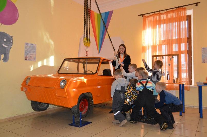 Экскурсия начинается с первого зала «Механики». Все дети выстраиваются вокруг экскурсовода.