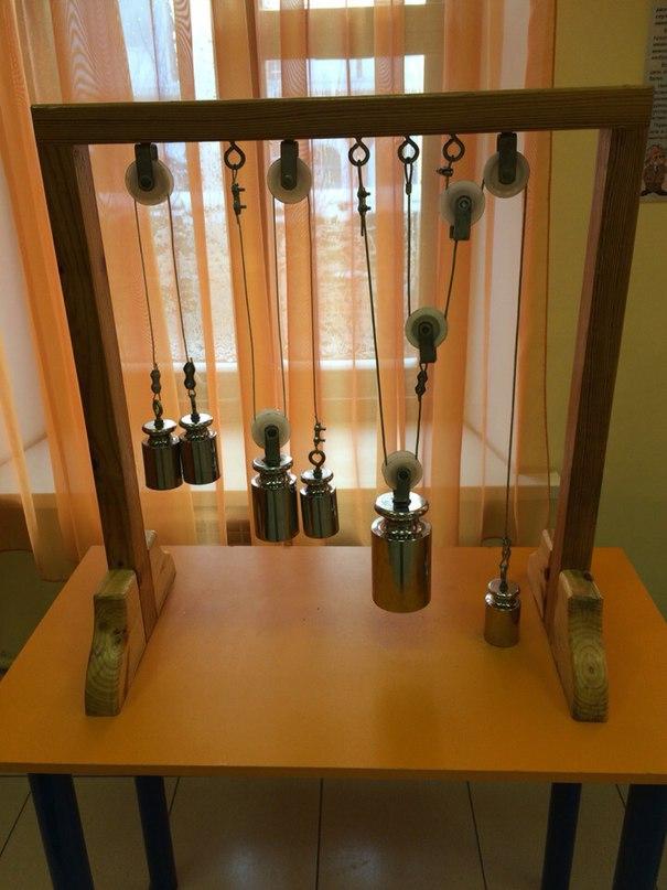 Э:— Давайте тогда порассуждаем, как же все-таки нам так запросто удалось поднять свой собственный вес и тяжелый автомобиль? Мы использовали специальный увеличитель силы, который называется «система блоков». Блоки бывают неподвижными. И подвижными. (На маленькой модели экскурсовод указывает, где подвижный блок, а где неподвижный) Неподвижный блок не дает никакого выигрыша в силе и в первом случае (указывает на две одинаковые гири) просто уравновешиваем грузики весом в один килограмм. Один и один висят одинаково. Во втором случае к неподвижному блоку добавляют один подвижный блок. А каждый подвижный блок дает выигрыш в силе в целых 2 раза. И теперь уже грузик в один килограмм мы можем уравновесить с грузиком в два килограмма. Видите? Один и два висят на одном уровне. (Указывает на уравновешенные гири весом в 1 и в 2 кг). Ну а в третьем случае добавляется целых три подвижных блока. Давайте посчитаем, сколько тогда будет выигрыш в силе в данном случае: два умножаем на два?