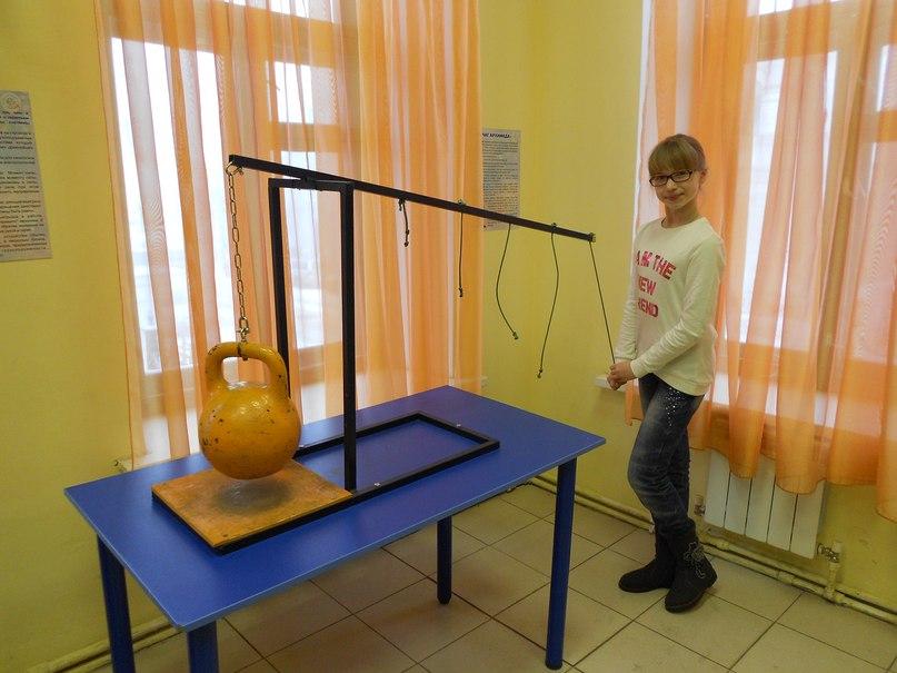 Э: Есть еще один увеличитель силы, ребята. Называется он Рычаг Архимеда. Эта часть (указывает на отрезок слева) называется «точкой опоры», а это (указывает на оставшуюся часть справа)— плечо от нее. Попробуйте потянуть с начала за ближнюю веревочку. (Экскурсовод вызывает одного ребенка и просит потянуть самую ближнюю к гире веревочку. Ребенок тянет и у него это получается с трудом.) А теперь попытаемся потянуть за крайнюю веревочку (тот же самый ребенок тянет самую дальнюю от гири веревку). Где тянуть было легче?