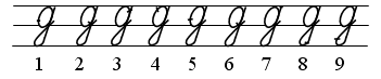 Начинаем выше нижней линейки. Слева направо прописываем полуовальную линию, коснувшись нижней линейки (1). Поднимаем ее вверх (2), закругляем влево, коснувшись верхней линейки (3), опускаем вниз, «закрываем» овал (4), делаем повтор в нижней части овала (5). Линию повтора продолжаем до верхней линейки, отклоняясь вправо (6). Опускаем вниз прямую (7). Не дойдя до дополнительной линейки, прописываем закругление влево, коснувшись ее (8). Ведем плавную линию вверх, отклоняясь вправо, пересекаем прямую на нижней линейке (9).