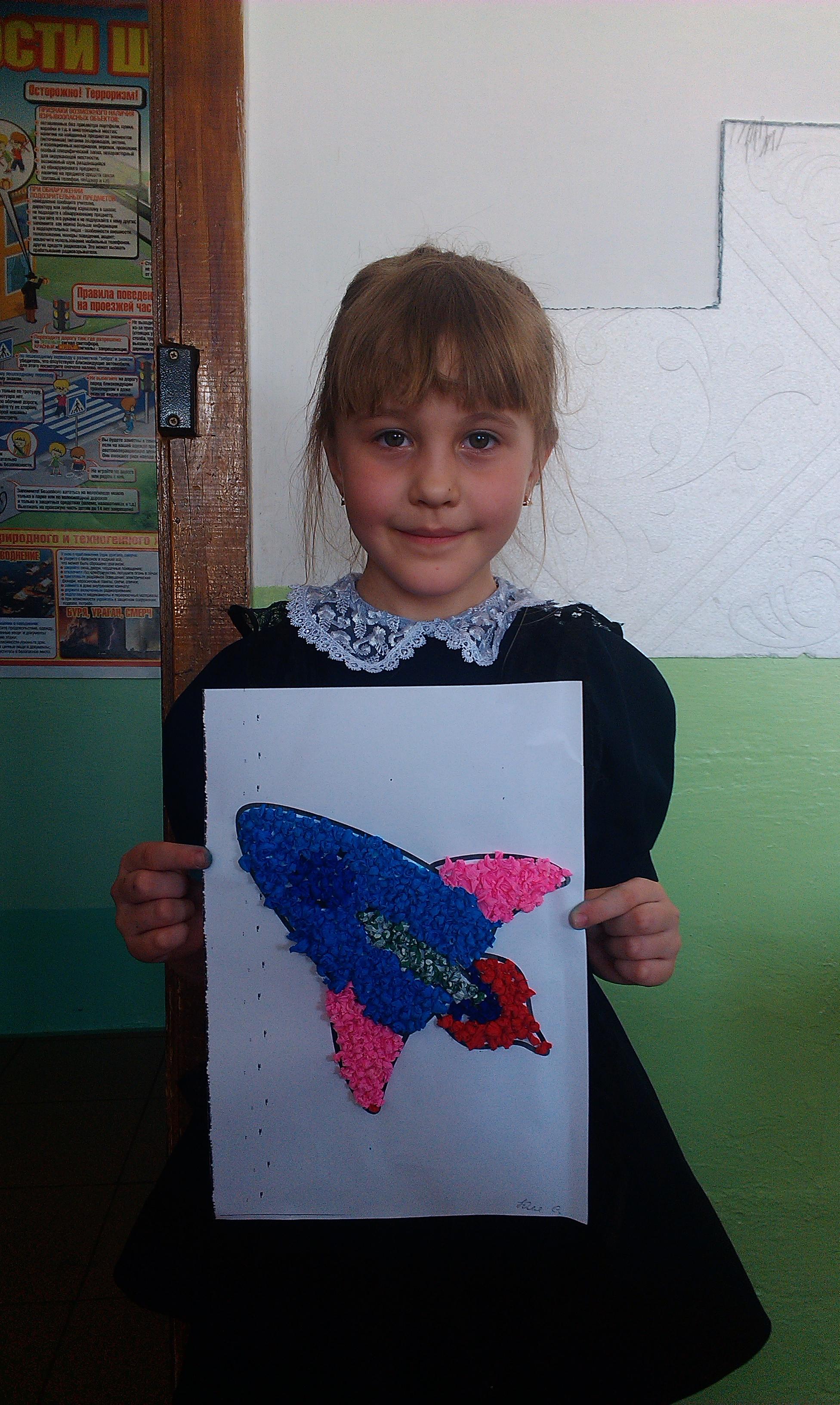- образец работы, презентация о первом полёте в космос, презентация о Юрии Гагарине, рисунок, нанесённый на бумагу, кусочки гофрированной бумаги разных цветов, клей, кисточка.