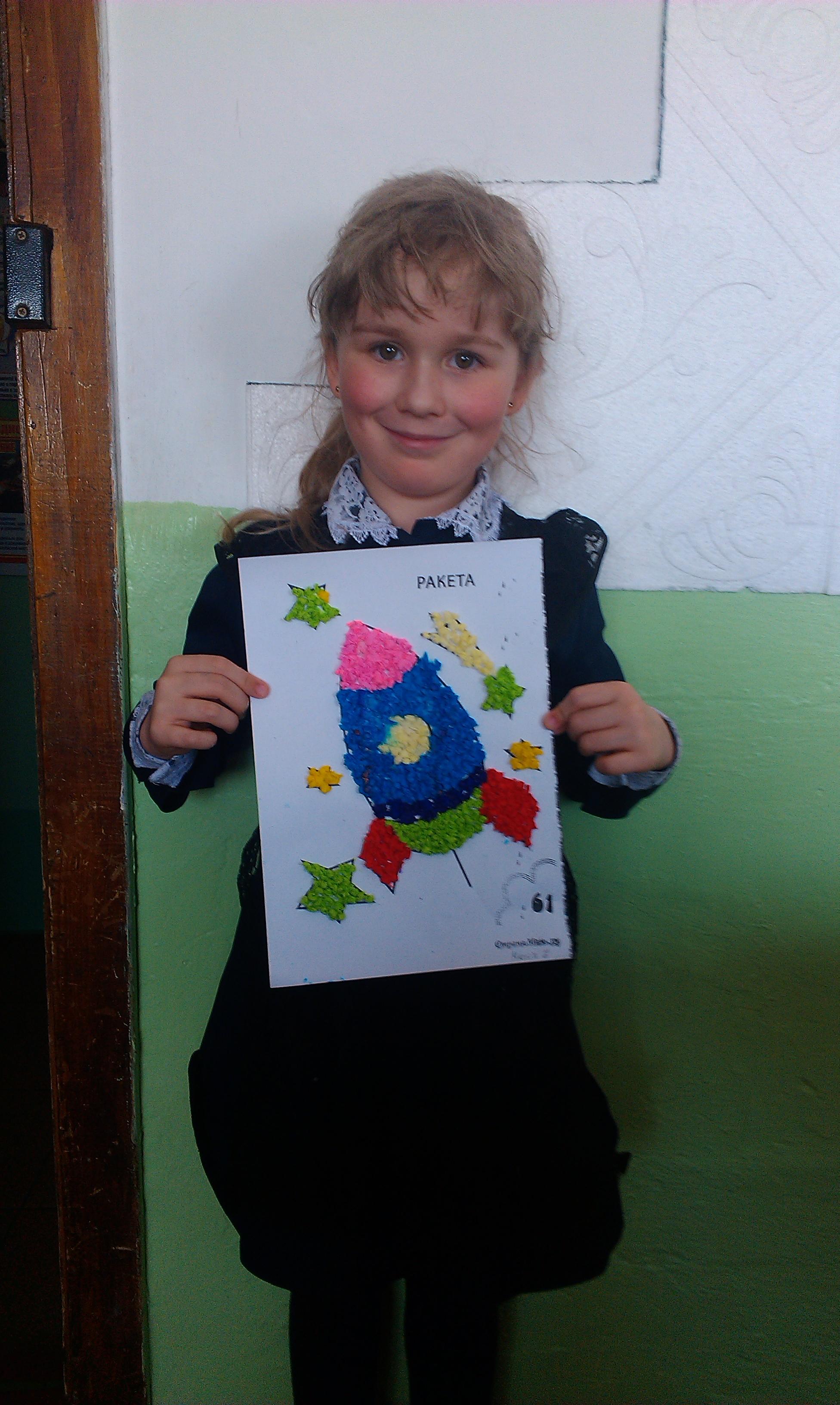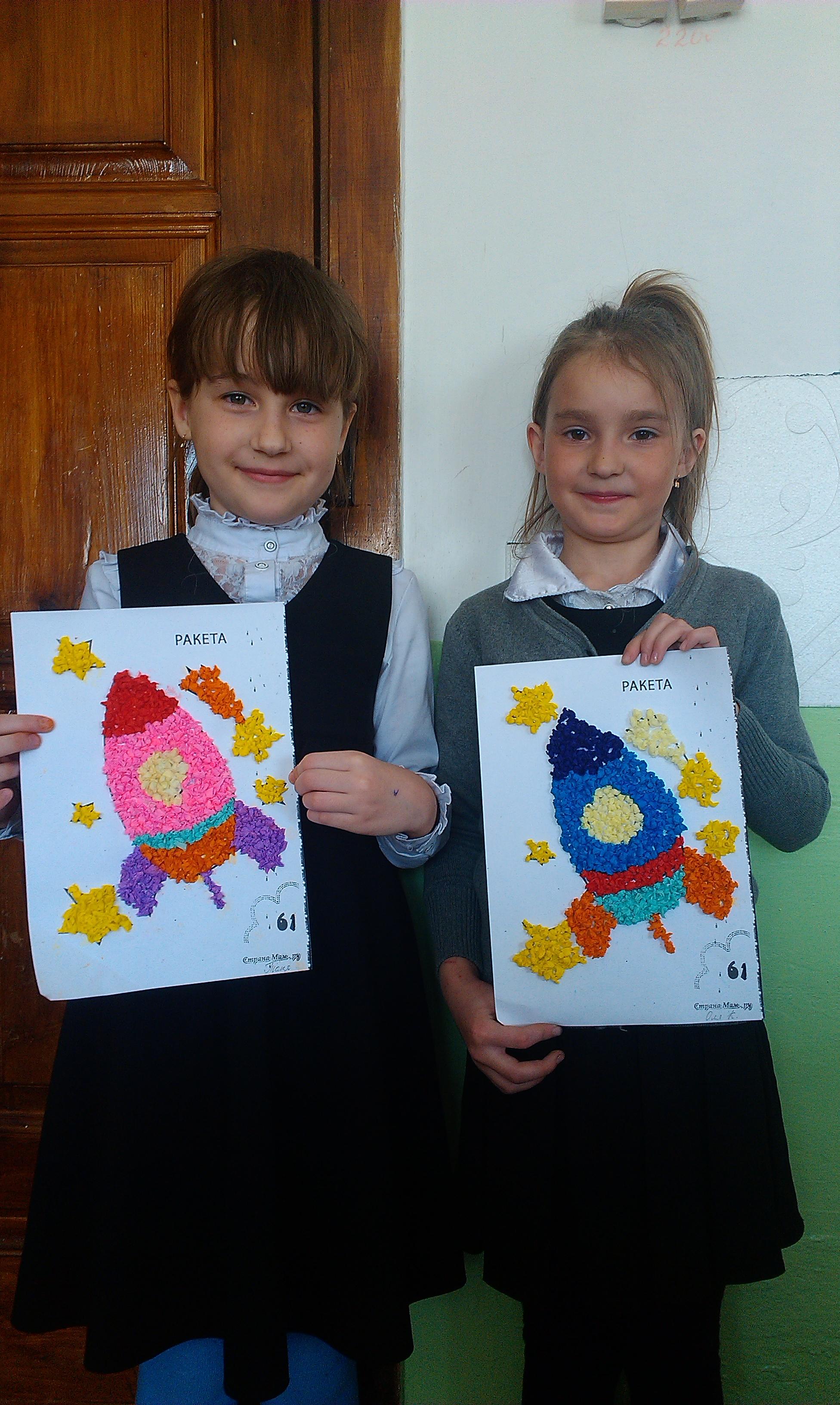 Показ образца: - Правильно, это ракета. Мы с вами сегодня украсим ракеты. Я вам раздаю картинки с изображением ракеты, вам надо определиться, какого цвета будет та или иная деталь у ракеты. Затем из кусочков гофрированной бумаги катаем горошки. Катаем их пальчиками, а не ладошками и желательно одновременно двумя руками. Затем, когда горошки готовы, на деталь ракеты намазываем кисточкой клей ПВА, и прикладываем наши горошки, немного придавливая их руками. Так выполняем всю работу.