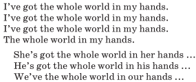 Речевой материал: текст о Бразилии и Италии; песни “I’ve got the whole world in my hands”, “What a wonderful world”.
