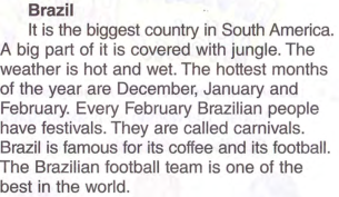 Give me the names of other countries, continents, weather, food, sport. Good! Today we will get acquainted with two countries. Look at the board. There are some words you see in the text about countries. (записать на доске слова: a carnival, coffee, football, pasta, pizza) How do you think what are these countries? Where are these words from? OK, let’s check your guesses.