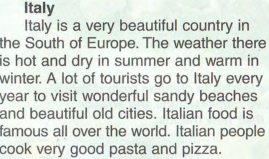 For example, I’d like to go to Italy, because it’s beautiful country. The weather is hot and dry in summer and warm in winter. I’d like to visit Italian beaches… . Good!