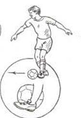 2.Показ: носок опорной ноги всегда должен совпадать с направлением предполагаемого движения мяча. Стопа согнутой в коленном суставе бьющей ноги перед ударом сильно разворачивается наружу и выносится вперед, ее голеностоп напряжен. При соприкосновении стопы с серединой мяча туловище игрока наклоняется над мячом. Произведя удар, бьющая нога продолжает движение за мячом. Это движение называется проводкой. Проводка распространяется на все виды ударов.