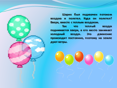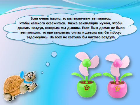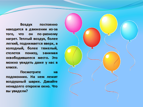 - А что такое сквозняк? Это слово мы часто слышим. (если в помещении открыть одновременно и форточку и дверь, то возникнет сильное движение воздуха. Его обычно и называют сквозняком. При сильном сквозняке тело человека быстро охлаждается и может начаться простуда, поэтому не следует открывать и окна и двери одновременно.