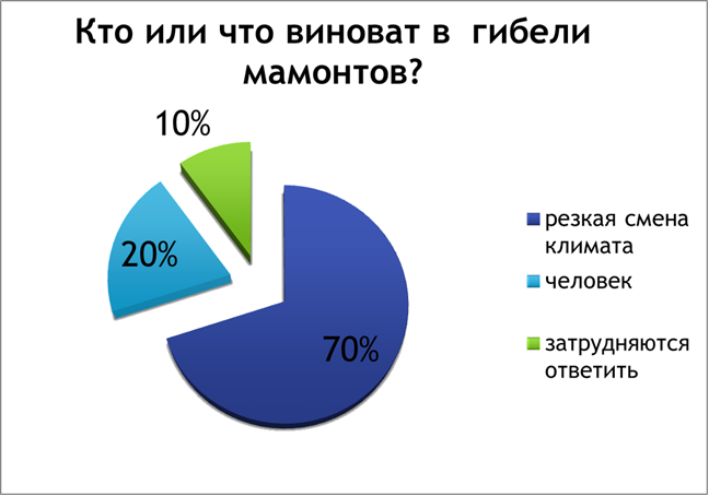 Я провела опрос одноклассников, родственников - всего 30 чел. По теме: кто виноват в исчезновении мамонтов. Большинство, 21человек(70%), - считают причиной гибели зверей, резкую смену климата, 6 опрошенных (20%),- обвиняют человека... Предполагаю: все они посмотрели голливудский фильм «Ледниковый период». 3 человека(10%) - затрудняются ответить, точнее, к моему удивлению о мамонтах ничего не знают. (Приложение 2, рис. 1)
