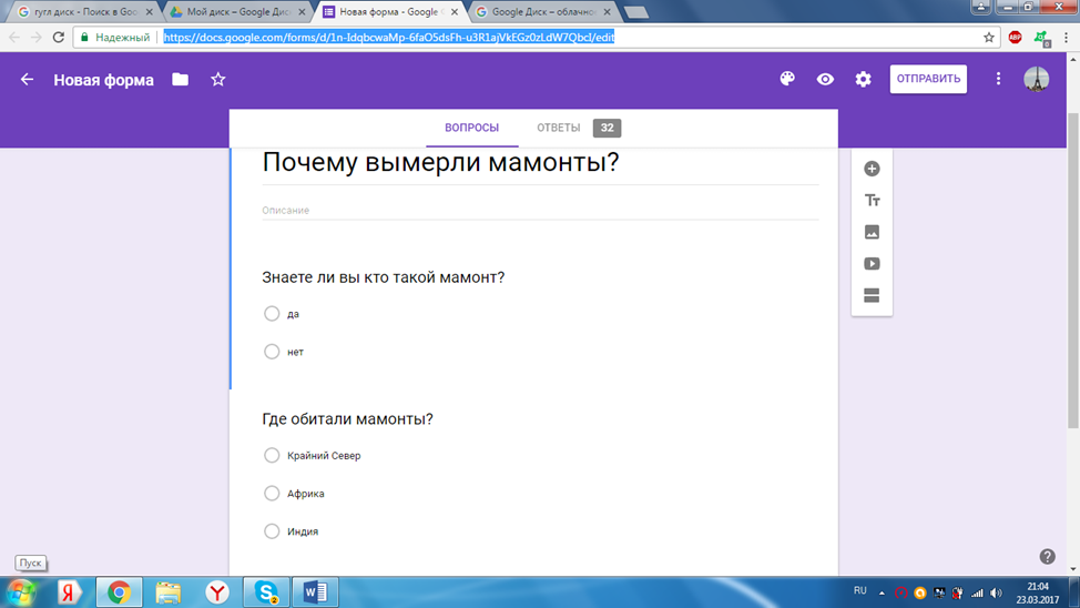 Для проведения исследования была создана онлайн-анкета с использованием опросных форм Google. (Приложение № 3)
