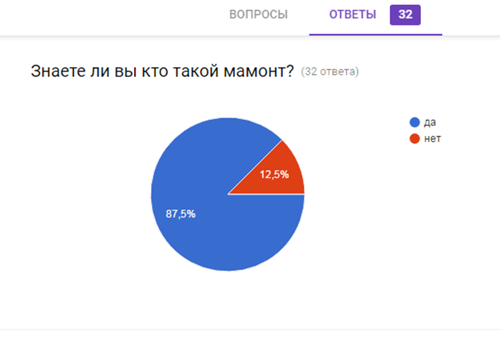 На первый вопрос анкеты: «Знайте ли вы, кто такой мамонт?» 28 респондентов ответили да, 4 - нет. Из полученных данных можно сделать вывод, что 87,5% знают, кто такой мамонт, 12,5%- нет. (Приложение №3, рис.2)