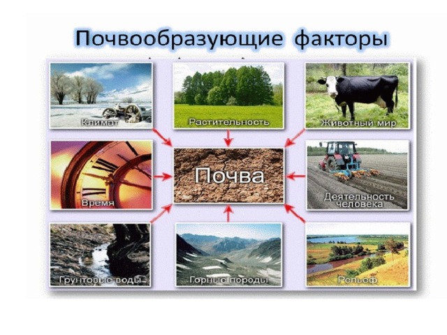 - Он образовался в результате взаимодействия горных пород, климата и живых организмов. Меняются климат, растительность, животный мир, горные породы – изменится и почва.